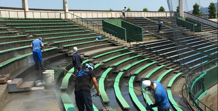 雪や雨風にさらされた外壁や客席のよごれも高圧温水と重曹ですっきり綺麗に。施工面積の大きな現場もお任せください!